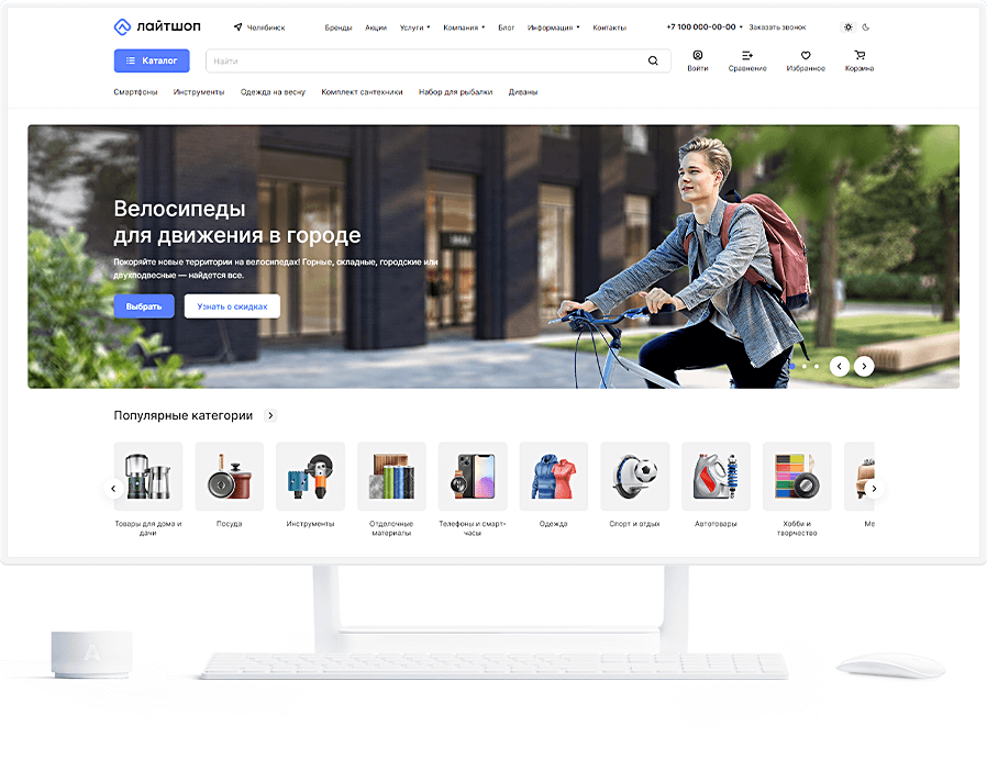 Готовые интернет-магазины Аспро включают в себя торговый каталог, версию для мобильных устройств и SEO-инструменты. Для начала продаж в онлайне нужно только наполнить сайт своим контентом и подключить функционал, который будет актуален вашей сфере бизнеса.